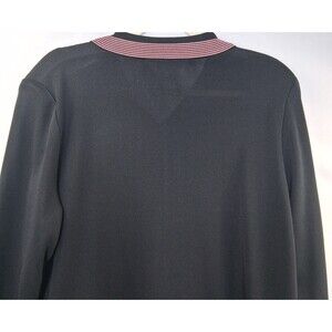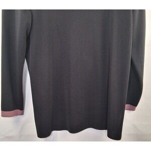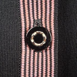Misook black knit cardigan with pink and white striped trim. Misook is a brand specializing in sophisticated, easy-to-care-for knitwear and professional clothing for women.