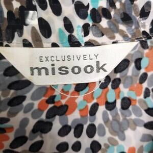 The Mistook Jacket is a women's large, artsy, and abstract full-zip jacket made of lightweight polyester material. The jacket features a polka dot pattern, long sleeves, a colorful multicolor design, and a regular fit. It is perfect for travel, casual, or workwear occasions in the fall and spring seasons. The jacket also includes a zipper closure and a brand like Misook, making it a stylish and versatile addition to any wardrobe.