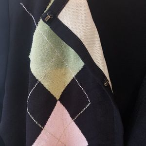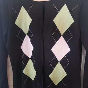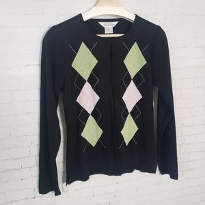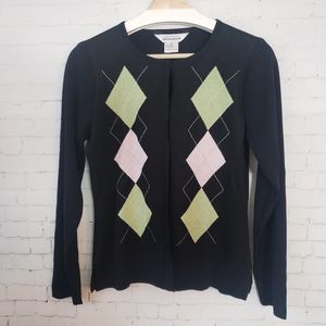 Exclusively Misook Cardigan Sweater Size Small Black Argyle Green Pink Preppy