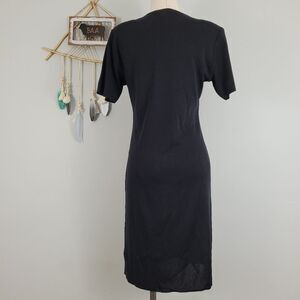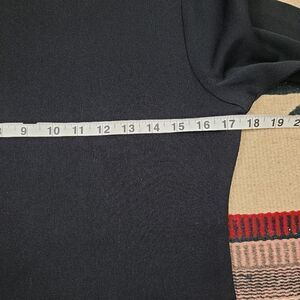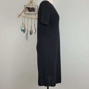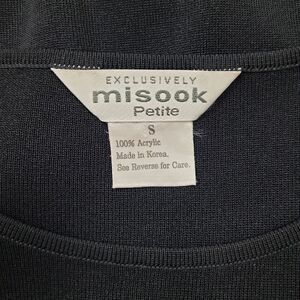 Exclusively Misook Petite Black Column Short/Knee Length Dress, Short Sleeve, 100% Acrylic, Semi Sheer, has some stretch, has shoulder pads.