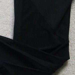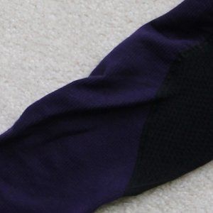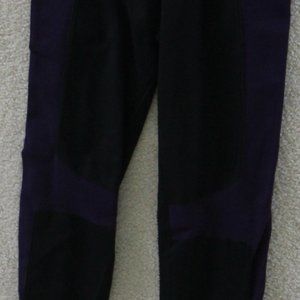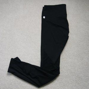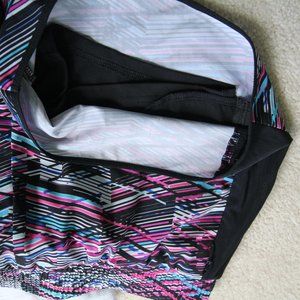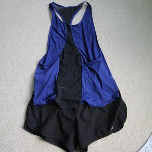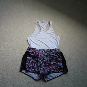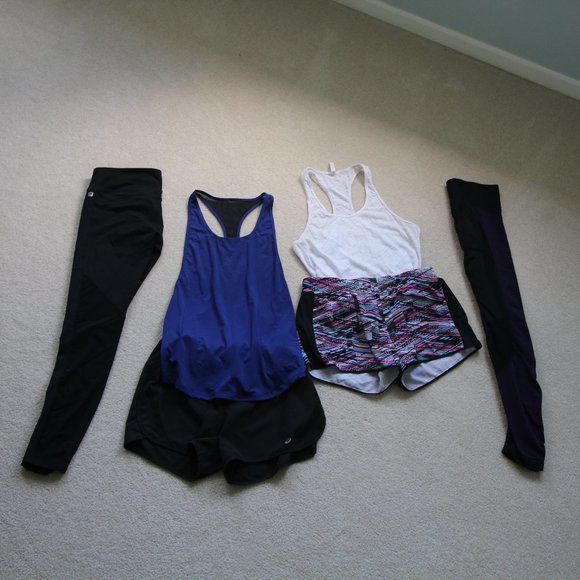 Two leggings, two tanks, two running shorts. (1) Black Fabletics leggings with purple accents (2) All black Fabletics leggings with mesh on calf (3) white burnout Fabletics tank top (4) black and blue Fabletics tank, low side profile, think side-boob (5) Patterned Fabletics running shorts with zipper pockets and built-in shorts (6) Black running shorts with built-in underwear.