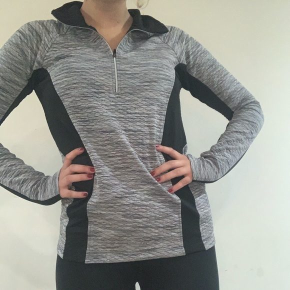 Gray, long sleeve, exercise zip-up. Has thumb holes (not a wide open hole, covered by fabric).