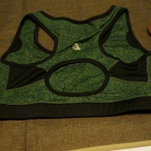 Green and black sports bra with geometric pattern. Black elastic band. Cup inserts not included. Keyhole on back with mesh detail.