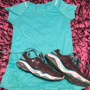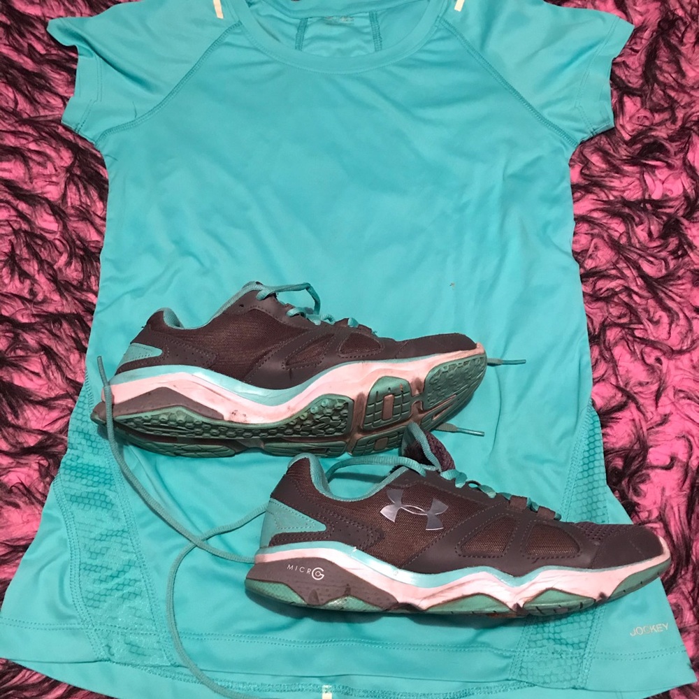 Under Armour shoes size 8 and jockey reflector T-shirt. Sweat resistant t shirt for running or jogging at night time. Shirt is a size medium