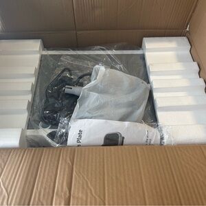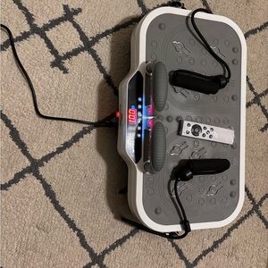Black vibration platform with remote control and accessories. Ideal for fitness and exercise routines.