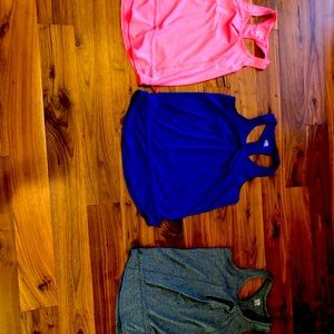 3 exercise tops in vibrant colors. Never used. No tags. Weatherproof 32 degrees cool. Draw string at bottom of shirt. Super comfortable. Can buy all 3 or separately. All 3 for $30 or separately for $15 each.