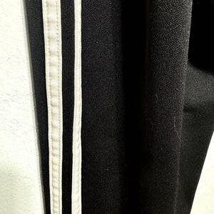 Sweatpants are a black color with white stripes down the sides.