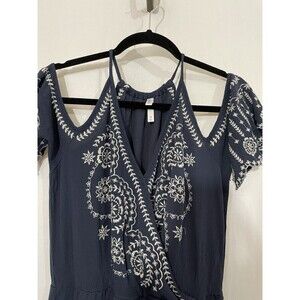 Embrace your free-spirited style with the Xhilaration Cold Shoulder Boho Dress. This dress boasts an intricate floral pattern with embroidered accents that add a touch of bohemian charm. The V-neckline and short cold shoulder sleeves create a flattering and unique silhouette, perfect for any casual or travel occasion.