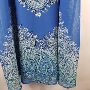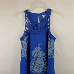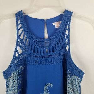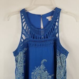 Size S. Blue paisley crochet accents. Sleeveless. Approximate measurements are pit to pit 16". Length is approximately 35". Polyester. Very pretty.