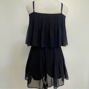 Stay cool and stylish with this Exlura black romper featuring flowy chiffon overlay. Designed to look like a two-piece dress, this romper combines comfort and elegance with a pleated layered bodice, adjustable spaghetti straps and breathable fabric. Shorts are fully lined underneath the sheer overlay, making it perfect for summer events, date nights or vacations. New without tags, never worn. Excellent condition.