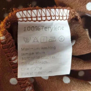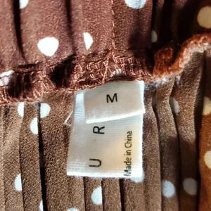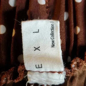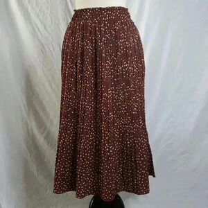 This skirt by Exlura is in excellent condition with no stains, picks, etc. Coffee brown color with white polka dots. Skirt is pleated, and has 2 pockets. Elasticized, high waist. pull-on styling. Midi to maxi length.