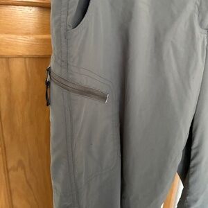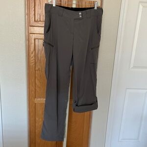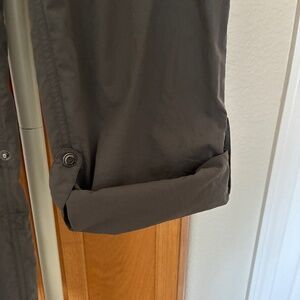 These Exofficio Nomad cargo pants are 32” long, size 6, with lower cut waist measuring about 16.5” lying flat. In very good condition, these are great hiking and travel pants. Also having UPF 30+ sun protection and snap closures to take pants to mid-calf level. Two front and two zip side pockets.