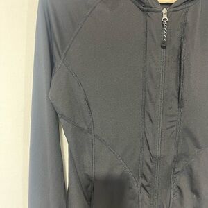 This hoodie jacket is very lightweight and made of a stretch jersey knit. Super comfy for layering!