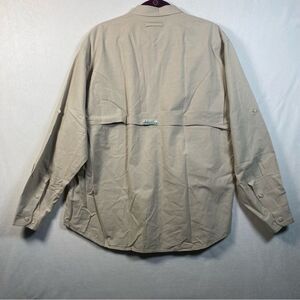 Exofficio Light Khaki Roll Tab Sleeve Buzz Off Shirt Size Large. Excellent pre-owned condition. 100% cotton. Button down with long button tab sleeves. 2 front button pockets. Back vented mesh flap. Slight high low hem. Measures approximately chest 48", length 29/31", sleeve 25".