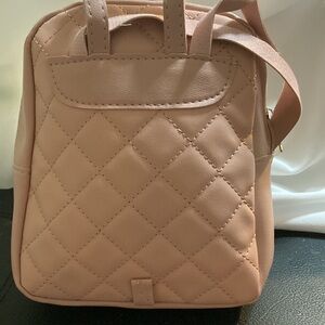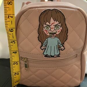 This mini backpack is a flesh color peach with Regan MacNeil on the front. The bag itself is a quilted like decoration.