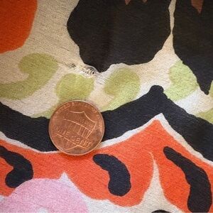 This vintage extra-large silk scarf features a vibrant and intricate paisley-inspired design. The scarf showcases a symmetrical pattern with a rich color palette, including shades of pink, orange, black, brown, and hints of green and blue. The design is reminiscent of a kaleidoscope, with swirling motifs and floral elements. The scarf is bordered by a wide, plain off-white linen fabric with a fringed edge, adding a textural contrast to the smooth silk.