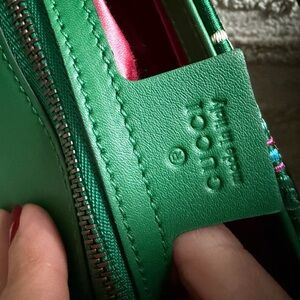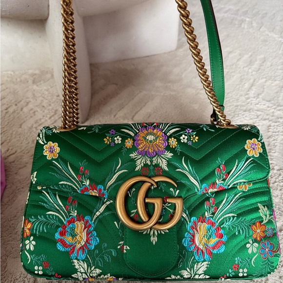 Luxurious Gucci shoulder bag in green with floral embroidery. Features gold chain strap and iconic logo.
