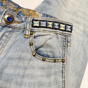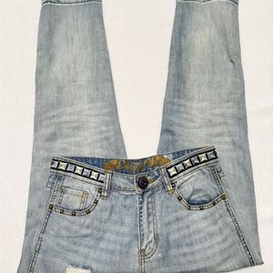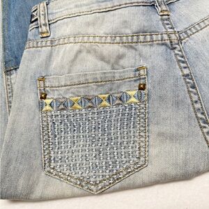 Elevate your style with these light blue straight leg jeans, featuring unique patchwork and studded accents. Perfect for a trendy, casual look.