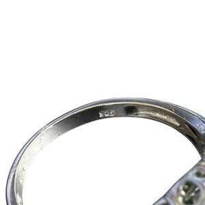 A striking sterling silver ring featuring a vibrant green gemstone centerpiece accented by opal side stones. An elegant choice for special occasions.
