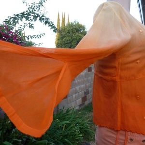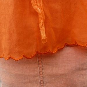 Exotic Tangerine Ruby N Style Bohemian Blouse with tiny little Silver embellishments adorning the front. The back has a dainty draw string. Decorative slits on the sleeves and one slit in the front below the breast. A beautiful scallop design on the bottom.