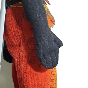 Exotic African American one of a kind handmade doll with stand. Beautiful full bold colors and handsewn beaded tribal outfit. She comes with a metal stand. Please see all pictures for details. When on the stand, her head tends to lean back. She was made more for a doll or couch, shelf sitter, rag doll. She has never been played with, only displayed. Her eyes and mouth are buttons. She has a beaded top, necklace, and the belt trim around her skirt, which has beaded tassels all the way around her waist. She is approximately 16" long. Makers tag still attached. Please see all pictures for details. This could be a doll for an older child. This is a one of a kind handmade doll.