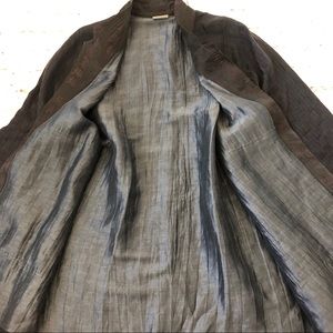 Nice jacket in gently worn condition. Open closure. Very nice elegant fit. Nice silk and linen blend. 2 side pockets. Very ligth piling on sleeves, no stains. No lining.