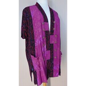 Introducing a stunning Exotica kimono duster in a beautiful purple, perfect for those who love the Gothic and witchy style. This blouse is made of 100% Rayon material and features a collared neckline, short sleeves, and an open closure. The oversize and baggy fit is perfect for a casual occasion and it has side slits for added style. This kimono duster is suitable for all seasons, with pockets for convenience. It is available in size O/s fits most and is a great addition to any wardrobe. The vintage design adds a touch of uniqueness, while the modern style makes it perfect for any occasion. Made in Indonesia, this blouse is a must-have for any fashion-forward woman.