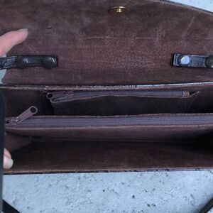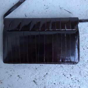 This is a beautiful eel skin vintage shoulder bag/clutch. It’s in beautiful condition color is a rich dark chocolate brown. Inside is very clean, please look at the pictures. Measures approximately 10 1/2 x 6 1/2 x 2 1/2, shoulder strap drop approximately 17