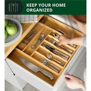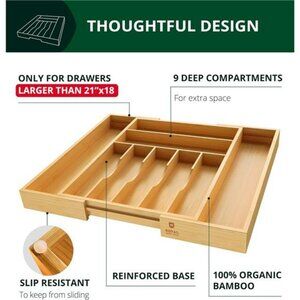 ππ ππππ ππππππππ πππππππ πππππππ: Our deep bamboo drawer organizer is ideal for saving kitchen storage space, thanks to its adjustable storage drawers that expand from 17βx13β to 17x19.6β wide with 1.9β deep slots. Easy to use and ideal for helping to maximize kitchen storage space, simply pull apart from the sides for additional storage space and a more secure fit for wider drawers. Different sized compartments allow for standard silverware and large utensil placement