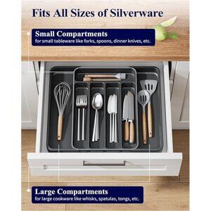 🧿SORTED AND ACCESSIBLE: Equipped with five small sections, this kitchen drawer organiser provides ample space for knives, forks, and spoons. The other two larger sections are perfect for kitchen tools like spatulas, whisks, and tongs. The clear organization ensures quick access to your utensils and tools, making cooking more efficient.