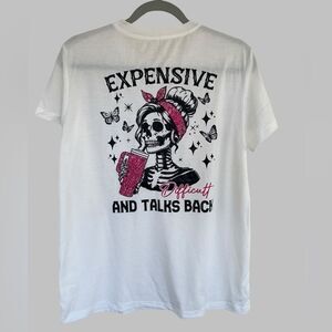 Add a dose of sarcastic charm to your wardrobe with this brand new “Expensive Difficult Talks Back” women’s graphic tee—a bold and edgy piece featuring a skeleton lady casually sipping from a tumbler. Size Medium, approximately 19.5” pit to pit and 26” length.