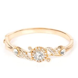 Dotted in dainty white rhinestones, leafy and floral gold frames swoop around glitzy white rhinestone centers atop a dainty gold bangle-like bracelet, resulting in an elegant centerpiece.