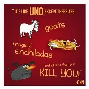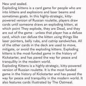 Players draw cards until someone draws an Exploding Kitten, at which point they explode, they are dead, and out of the game - unless that player has a Defuse card, which can defuse the Kitten using things like laser pointers, belly rubs, and catnip sandwiches. All of the other cards in the deck are used to move, mitigate, or avoid the Exploding Kittens. "