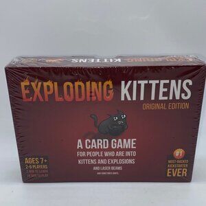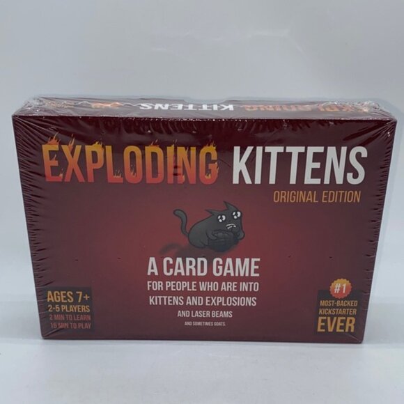 Dive into the thrilling world of Exploding Kittens with this Original Edition card game. Featuring a striking red design, it's perfect for fans of kittens and explosions. For ages 7+. 2-5 players. New factory sealed.