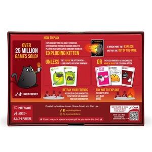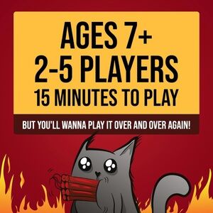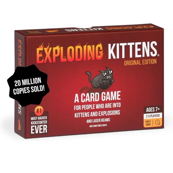 Exploding Kittens Card Game (Original Edition). Get ready for an explosion of laughter and entertainment with the Exploding Kittens Card Game. This award-winning game is hilarious, fast-paced and is perfect to play with friends and family. It's an original edition card game for people who are into kittens, explosions, laser beams, and sometimes goats. Players draw cards until someone draws an Exploding Kitten, at which they're out of the game until they have a defuse card. Exploding Kittens is the most-backed crowd funded project ever, the most-funded game in the history of Kickstarter, and has paved the way for peace and tranquility in the modern world. Ages 7 & up, 2 - 5 players, 15 minutes approximate game time. Includes 56 playing cards & instruction manual. Exploding Kittens Inc brand. Brand new & sealed in box. Perfect for board game nights with friends & family!