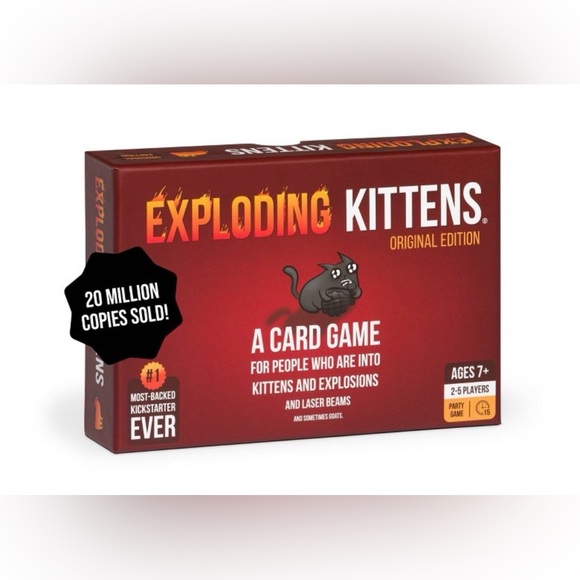 Exploding Kittens is a card game for people who are into kittens and explosions and laser beams and sometimes goats. In this highly-strategic, kitty-powered card game, players draw cards until someone draws an exploding kitten, at which point they explode, they are dead, and they are out of the game - unless that player has a defuse card, which can defuse the kitten using things like laser pointers, belly rubs, and catnip sandwiches. All of the other cards in the deck are used to move, mitigate, or avoid the exploding kittens. A perfect solution if you are looking to play family card games and kid card games. Add it to your collection of fun card games. Exploding Kittens is the most-funded game in the history of Kickstarter, and has paved the way for peace and tranquility in the modern world.