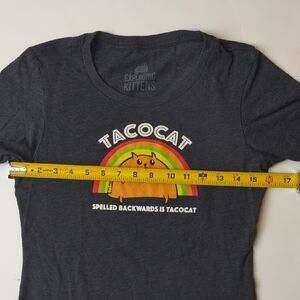 Dark gray tee featuring a colorful Tacocat graphic from Exploding Kittens.