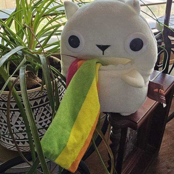 White cat plush by Exploding Kittens with adjustable rainbow fabric.