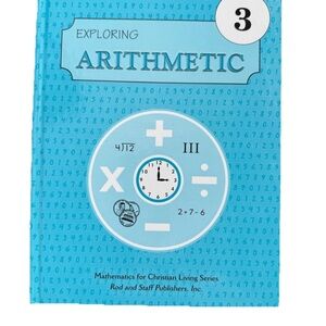 Exploring Arithmetic book with a blue cover. Features mathematical symbols and a clock design. Hardcover memoria press student book.
