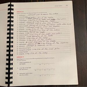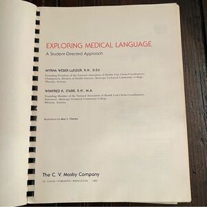 This spiral soft cover text book is “Exploring Medical Language”. The book is a student directed approach. This item flows through lessons on this subject. A few of the exercises a have been completed but the majority have not. This is a very educational item. The book is 9” x 11”.