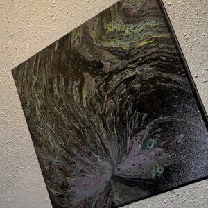 The colors and design of this piece will grab anyone's attention. The Explosion of a Beautiful Metallic Purple with Black background filled with cells and ripples of Green, Yellow and Light Blue.. This piece can do so much to the imagination. Galaxy-ish, maybe. Gorgeous, Yes.