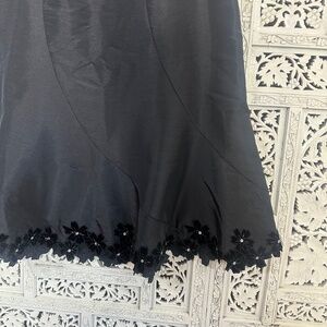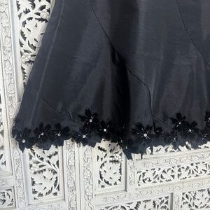 Gorgeous embellished black skirt with velvet beaded flowers on the bottom trim. Tagged 12 but measurements indicate it may fit larger. Hits a little below the knee. Waist across 17" total length 25.5"