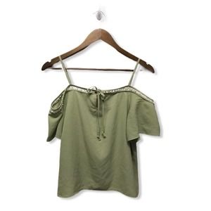 Flawless condition! Beautiful blouse with cold shoulders. Pairs great with any denim! Has a white ribbon laced detail around top and a self tie front for extra detail! Bundle for great discounts