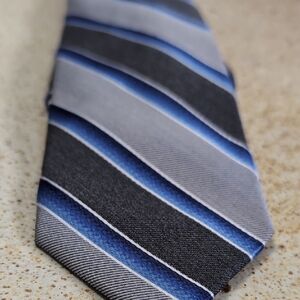 This sophisticated tie from Express features a classic diagonal stripe pattern in gray and blue, crafted from silk for a refined finish. Its balanced design and standard width make it a versatile addition to any formal wardrobe.