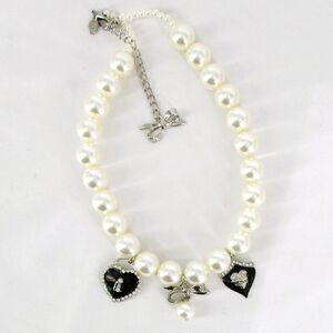 Express 18" Enamel Hearts Bows Chunky Faux Pearls Necklace Rhinestones Silver