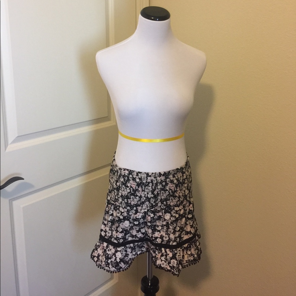 New with tag, Express elastic waist floral skirt in size S. Colors are black, cream and pink. Laid flat, waist is 14 inches and length is 14 inches.
