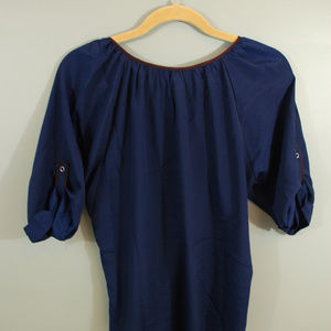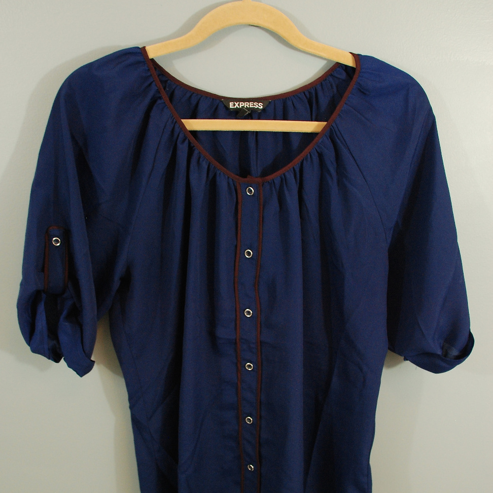 Comfortable, and flattering button down Express shirt. Dark blue with brown detail. 100% Polyester. Size L