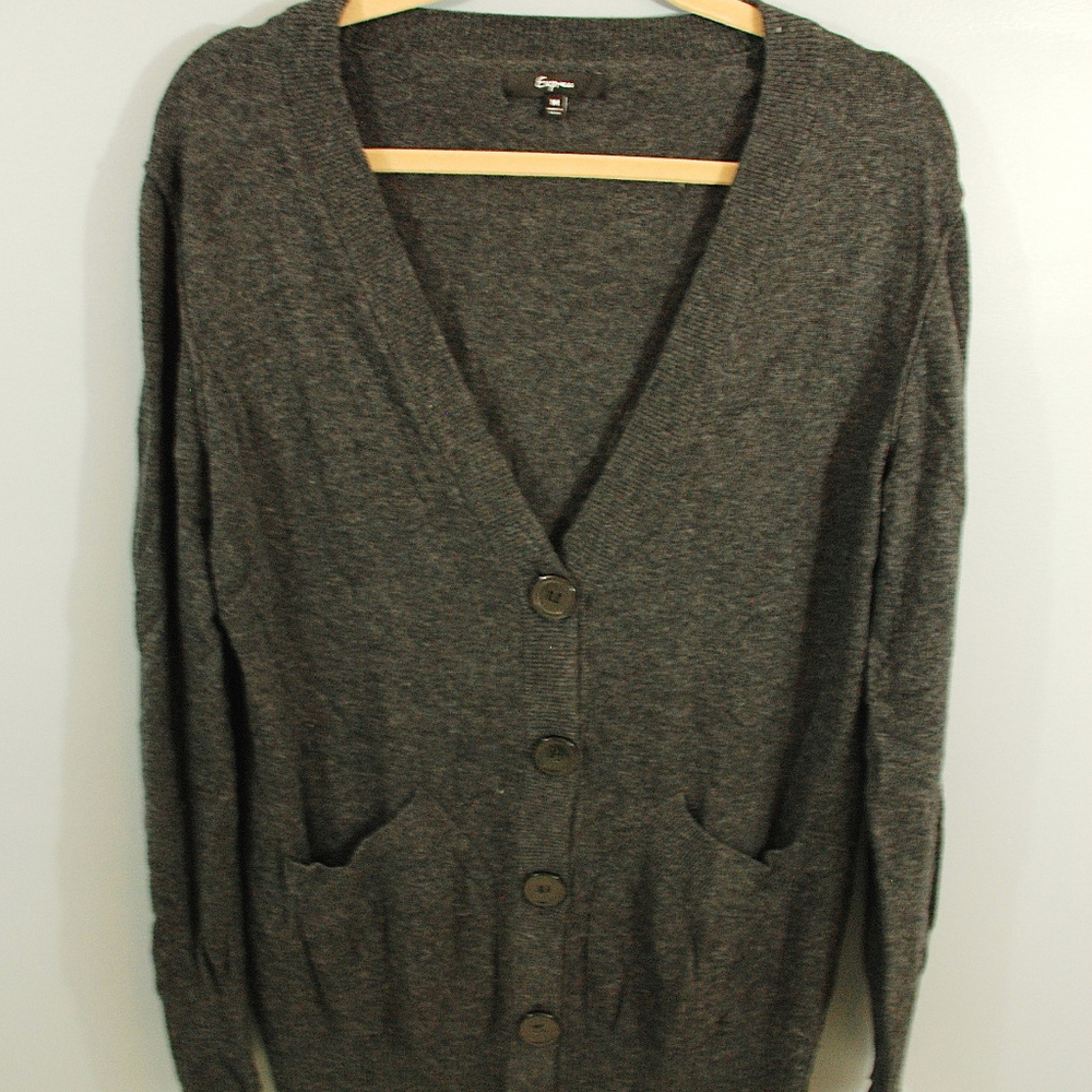 VERY comfortable grey Express Button Down Sweater. May wear as is with leggings or jeans, or as an open cardigan. 40% Nylon, 30% Rayon, 30% Wool.