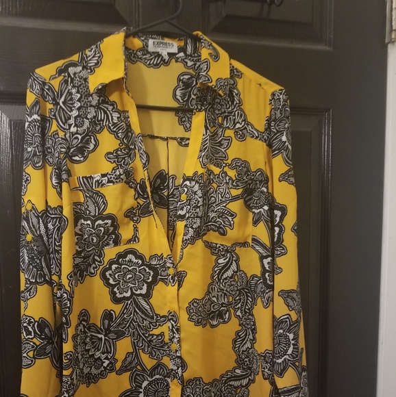 Express, "The Portofino Shirt". Gold with black flowers. Option to make sleeves three quarter length.