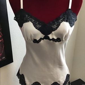 Express Design Studio Silk Cami. Winter White with Black Lace Detail. Adjustable Straps. Side Slits. Size M. Absolutely Sexy and Gorgeous. A Classic. Great Staple Piece. Can be worn alone with Slacks or Skirt or with Leather Jacket, Velvet Jacket or Other. Worn Once. Excellent Condition.